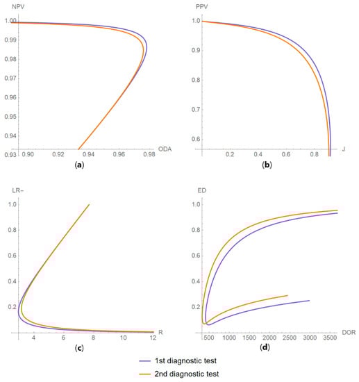As any two of the diagnostic accuracy measures can be expressed as functions of their sensitivities, their respective parametric equations are plotted to show the relations between the values of the two measures of each test (Figure 9).