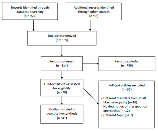 From 1984 to 2019, the database searched of 975 articles with the keywords “small fiber neuropathy” AND “rehabilitation” OR “therapy” OR “treatment”, whose titles and abstracts were screened by the reviewers. The papers remained for full text screening were 78 and the eligibility of the study inclusion was assessed independently. Forty-one publications met the inclusion criteria and were included in the systematic review. Thirty-seven were excluded for the following reasons: 18 involved individuals with different disorders from SFN, 7 examined different topics from our aim, 12 did not present any therapeutic procedure (Figure 1).