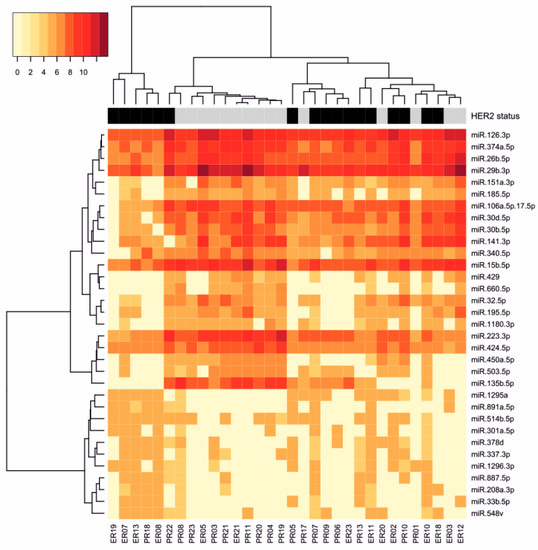 Heatmap depicting expression of 33 HER2-associated miRNAs among analyzed single hormone receptor-positive breast tumors; color legend indicates HER2 status; HER2-negative cases are marked in grey, HER2-positive cases are marked in black.