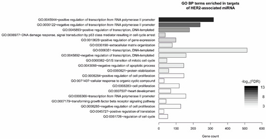 Gene Ontology Biological Process (GO BP) terms enriched in genes targeted by HER2-associated miRNAs in single hormone receptor-positive breast tumors; top20 terms/pathways with the lowest p-value plotted as the number of associated genes (gene count) and ordered according to -log 10(FDR); analyzed with Functional Annotation Tool by DAVID Bioinformatics Resources 6.81.