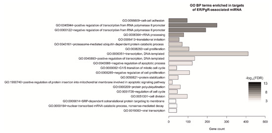 Gene Ontology Biological Process (GO BP) terms enriched in genes targeted by ER/PgR-associated miRNAs in single hormone receptor-positive breast cancers; top20 terms/pathways with the lowest p-value plotted as the number of associated genes (gene count) and ordered according to -log 10(FDR); analyzed with Functional Annotation Tool by DAVID Bioinformatics Resources 6.81.