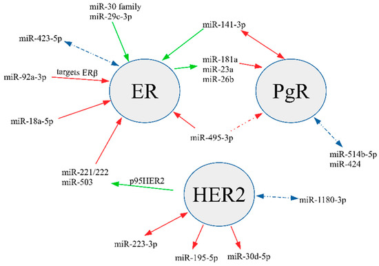 Key interactions between selected miRNAs, ER, PgR, and HER2. Red lines illustrate a known downregulating effect or an inverse association between miRNA and receptor; green lines depict an upregulating effect or a positive association between miRNA and receptor; blue lines show a potential relationship.