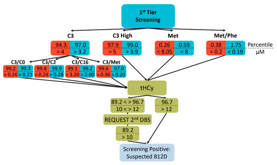 Measurement of MMA and tHCy, which are substrates of the two VitB12-dependent enzymatic reactions and thus biomarkers of functional B12D [14], require methods that are not feasible as first-tier analyses in newborn screening. For quantification of tHCy from dried blood spots; however, commercial kits are readily available. In contrast, propionylcarnitine (C3) and methionine, which are metabolites in these metabolic pathways upstream and downstream of MMA and HCy, respectively, and indicative for B12D, albeit with low specificity, are commonly determined in expanded newborn screening. Therefore, based on published data [3,10], we developed a decision algorithm based on C3 and methionine and distinct ratios of these markers to select samples for measurement of tHCy as a second-tier marker (Figure 1). Following a recent publication [12] and simultaneous with a change of the analytic instrument after 8 months of screening for suspected B12D, we adjusted the selection algorithm towards a higher number of samples selected via low methionine as well as a stronger emphasis on the C3/Met ratio (Figure 1).