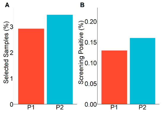 Screening overview. (A) Percentage of samples selected for second-tier measurement. Percentage of samples selected for total homocysteine (tHCy) measurement out of all samples analyzed according to the decision algorithm. Red bars show values for the first screening period, blue bars for period 2. (B) Percentage of screening positives. Percentage of screening-positive samples out of all samples analyzed according to the decision algorithm. Red bars show values for the first screening period, blue bars for period 2; tHCY, total homocysteine.