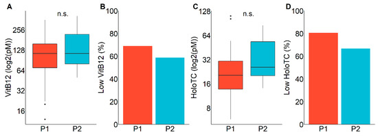 We evaluated our screening performance with respect to the obtained serum VitB12 and holoTC concentrations. Both VitB12 and holoTC concentrations were low on average (114 pM and 116 pM serum VitB12 and 19.8 and 23.6 pM holoTC for period 1 and 2), without significant difference between the observation periods (Figure 3A,C). Applying the tentative cutoff values for B12D according to Green et al. [1] (<148 pM for VitB12, also referred to “acute deficiency” [14], <35 pM for HoloTC), the resulting positive predictive values were 69% (29 out of 42) and 59% (10 out of 17) based on serum VitB12 and 81% (25 out of 31) and 67% (8 out of 12) based on holoTC concentrations for period 1 and 2, respectively (Figure 3B,D).