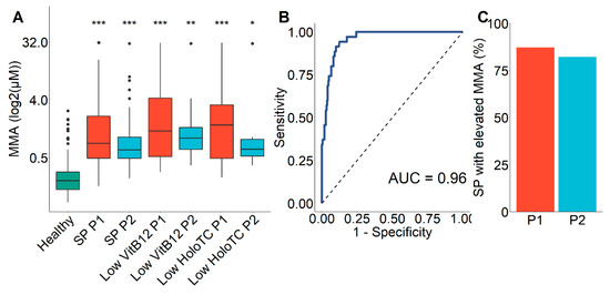 Evaluation of screening-positives by determination of, methylmalonic acid (MMA) from dried blood spots. (A) Markedly increased MMA concentrations in screening-positive samples. Boxplots for MMA serum concentrations of healthy newborn population (n = 242), screening-positives (n = 77 and n = 54 for period 1 and 2, respectively), screening-positives with known low serum vitamin B12 (VitB12) (n = 42 and n = 17 for period 1 and 2, respectively) and screening-positives with known low holotranscobalamin (holoTC) (N = 31 and N = 12 for period 1 and 2, respectively) concentrations are shown. *, p < 0.05; **, p < 0.01; ***, p < 0.001 vs. healthy, other comparisons were non-significant. (B) Receiver operating characteristic (ROC) curve analysis. Separation of newborns with normal and low VitB12 concentrations by MMA (cutoff: 0.423 µM). (C) Proportion of screening-positive samples with increased MMA concentrations. Red bars show values for the first screening period, blue bars for period 2 and green bars for healthy newborns; P1, first period; P2, second period of screening; SP, screening positive; AUC, area under the curve.