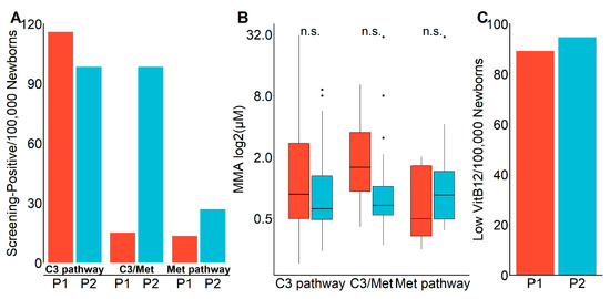 Impact of selection criteria on vitamin B12 (VitB12) screening performance. (A) Frequencies of screening-positives separated for the pathways via which samples have been selected for second-tier testing. Frequencies of samples selected via C3-dependent pathways (C3 high and C3 plus C3/C0, C3C2, or C3/C16), C3/Met, and methionine-dependent pathway (Met and Met/Phe), see Figure 1 for explanation, are depicted for indicated periods. (B) Methylmalonic acid (MMA) concentrations of samples selected via indicated pathways. Boxplots for MMA concentrations determined from dried blood spots of samples derived via indicated selection criteria and period. (C) Estimated frequency of low VitB12 in Austrian newborns. Frequency was estimated according to the number of screening-positives and proportion of low VitB12 concentrations within screening-positives. Red bars show values for the first screening period, blue bars for period 2; P1, first period; P2, second period of screening; n.s., non-significant.