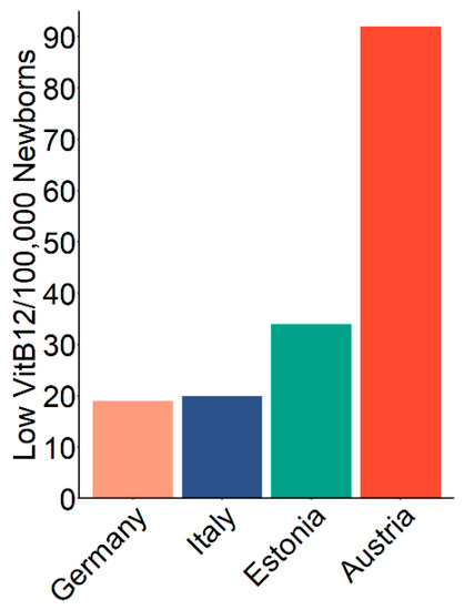 - Reinson, K.; Künnapas, K.; Kriisa, A.; Vals, M.-A.; Muru, K.; Õunap, K. High incidence of low vitamin B12 levels in Estonian newborns. Mol. Genet. Metab. Rep. 2018, 15, 1–5. [Google Scholar] [CrossRef]