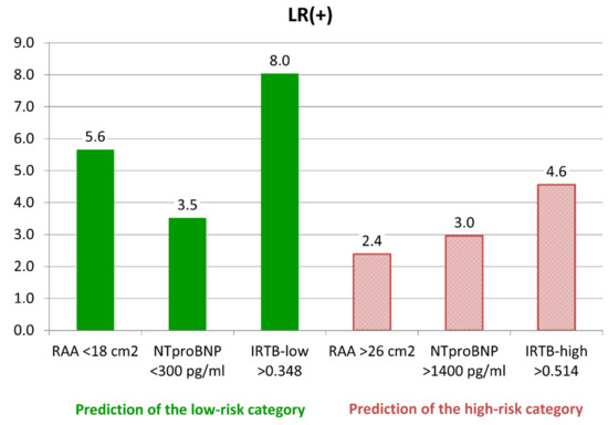Likelihood ratio of positive result (LR+)—comparison of different tests of the low-risk and high-risk categories identifications. Abbreviations: RAA—right atrial area, NTproBNP - N-terminated type B natriuretic pro-peptide, IRTB—multivariable models.