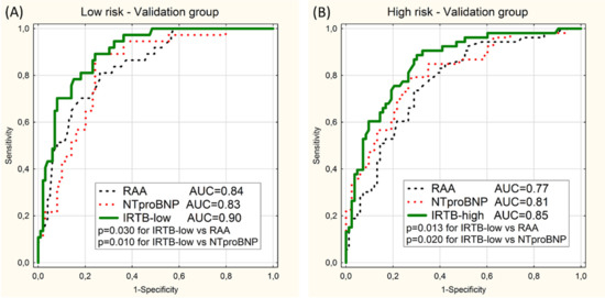 ROC curves for prediction of the low-risk category (A) and the high-risk category (B) in the validation group using 2 univariable models (RAA and NTproBNP) and the multivariable model (IRTB-low or IRTB-high). Values of area under curves (AUC) and p-values (p) are presented.