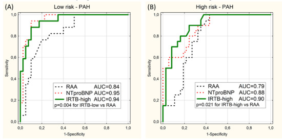 ROC curves for prediction of the low-risk category (A) and the high-risk category (B) in the PAH subgroup using 2 univariable models (RAA and NTproBNP) and the multivariable model (IRTB-low or IRTB-high). Values of area under curves (AUC) and significant p-values (p) are presented.
