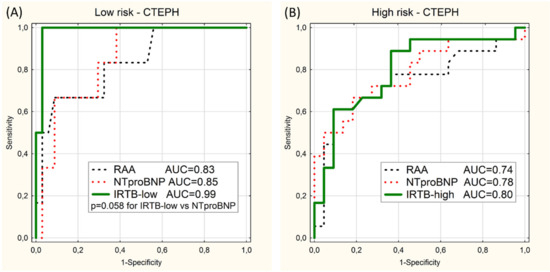 ROC curves for prediction of the low-risk category (A) and the high-risk category (B) in the CTEPH subgroup using 2 univariable models (RAA and NTproBNP) or the multivariable model (IRTB-low or IRTB-high). Values of area under curves (AUC) and p-value close to significance level (p) are presented.