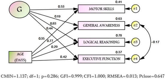 The structural model (Figure 1) shows that different components of abilities of 3-year-old children are differently affected by age and G-factor. So, the strongest effect the age has is on the “General awareness” (S2), while G-factor has the least influence on “General awareness” (S2). On the other hand, the most contribution of the G-factor is surveyed on “Logical reasoning” (S3), but the influence of age on “Logical reasoning” (S3) is minimal. In regards to “Motor skills” (S1) and “Executive function” (S4), the contribution of age and G-factor is almost the same.