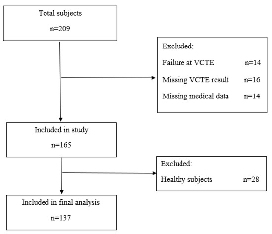 Two hundred and nine patients were scanned using the THE system. Forty-four patients were excluded from the analysis, due to failure at LSMs by VCTE, missing medical data and laboratory data from medical records, and for not having undergone LS measurements by both elastography methods (Figure 3). One hundred sixty-five patients were included the final analysis. The patients’ main characteristics are reported in Table 1.