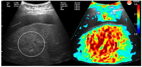 A multifrequency time harmonic waveform was produced by a specially designed vibrator, fixed inside the examination bed that mechanically stimulates the liver at a standard of 27, 33, 39, 44, 50, and 56 Hz (GAMPT mbH, Merseburg, Germany). For B-mode–guided positioning of the elastography profile and acquisition of shear waves in the liver, an ultrasound probe (SonixMDP, Ultrasonix, Scottsdale, AZ, USA) with a 2.5 MHz transducer (C5-2/60 convex) was placed in the right intercostal spaces for a better liver approach. The patient was asked to hold apnea for a few seconds while the 1-second acquisition was being made. The postprocessing consists of (i) axial displacement estimation; (ii) harmonic frequency selection via temporal Fourier decomposition; (iii) spatial band pass filtering; (iv) spatial-directional filtering; (v) shear wave speed estimation via phase gradient method, and (vi) weighed averaging to calculate the final shear wave speed map (details can be found in [14]). An ROI (region of interest) was then selected on the most homogeneous area (Figure 1 and Figure 2) in each of the 10 measurements.