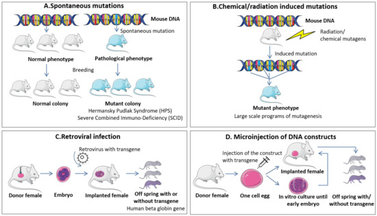 Among the first studies in mice genetics involved analysis of genetic mutations that spontaneously arise in breeding colonies. Some of these DNA modifications were associated with specific mutational events found in human pathologies and selectively bred to form colonies with mutated mice. The main mice models that were generated based on spontaneous mutations consist of the Hermansky Pudlak Syndrome (HPS), based on oculocutaneous pigment dilution mutations [57], and the Severe Combined Immuno-Deficiency (SCID) that are hypogammaglobulinaemic, and have severe B and T cell dysfunction that impedes their acquired immune response [58]. This last model has been extensively used since its discovery due to its compatibility with cells or tissue of foreign origin, being an ideal model for tumor xenotransplants. However, the frequency of spontaneous mutations is very low (rate of ~5 × 10−6 per locus) [59] and quite difficult to detect if no phenotypic changes occur due to specific changes in the DNA sequence (e.g., changes in the color and texture of the coat, distinct behavior, sign of illness/poor health and even death) [60]. Moreover, extensive validations are required in order to be certain that the new mutation is the accusatory factor of the modified trait. In this sense, controlled modifications of the mouse genomic make-up, termed “forward genetic” strategies, have been proven more efficient and reliable. Early events for induction of mutations consisted in exposure to radiation or chemical mutagens, such as ethylnitrosourea (ENU) [61]. The original article states that a dose of 250 mg/kg of ENU has the potency to induce a five times higher mutational rate than a dose of 600 R of x-ray. Due to its efficiency, the agent is also used nowadays for large-scale mutagenesis studies, and together with the advancement of infrastructure and techniques it is contributing to evaluation of specific patterns of gene expression of human diseases [60].