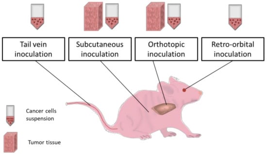In vivo routes of cancer inoculation. Tail vein, retro-orbital, subcutaneous and orthotopic routes are suitable for cancer inoculation in laboratory mice via cancer cells suspension injection. Some of these paths (tail vein and retro-orbital) ensure minimal invasiveness and safety for the animal, providing promising results especially for cancer hematological malignancies. Moreover, tail vein mode can be engaged for treatments administration and body fluids sampling [104] while retro-orbital route is more stressful for the animal [105]. Subcutaneous implantation technique is generally used in cancer research studies because of its easiness in execution and fast results monitorization but is not prone to gain metastatic features [106]. On the other hand, orthotopic route has the capacity to mimic live organism conditions during tumor progression and can lead to metastases [107,108]. Both two routes (subcutaneous and orthotopic) are applicable for both cell suspension and tumor tissue implantation using microsurgery. Tissue samples are characterized by heterogenous cellular populations and integrity of organization level. In addition, the adequate sites for tissue implantation have large area and layered structures, and this can favor the metastatic profile allowing cells networks development and movement [109]. Subcutaneous and orthotopic routes can be explored for implantation of different electronic devices or materials which can serve as therapeutic platforms including molecular levels evaluators [110].