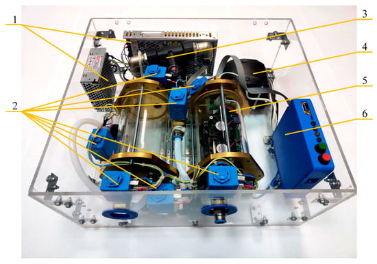 The indoor module was connected with a data and power cable to the interface module (6). The interface module contains I2C port expanders, through which switches and control buttons are implemented. With the help of these, an 8-relay block is connected, providing control of 7 valves (2) and a pump (4). The interface module is connected to the data analysis computer via a USB interface. Additionally, an RS-232 interface with a DB-9 connector was implemented.