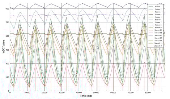 In the measuring module software was established so that the data obtained from channels 15 and 16 (without installed gas sensors) exhibited given constant values that were different from zero during heating, but null values during cooling (signals 15 and 16 are in the form of a meander in the graph). This is done to accurately separate the thermal cycling periods in the preprocessing stage, i.e., to synchronize the measurements. As a result, a record of 43,200 values is saved in the database for each individual patient (14 sensors and 2 channels, each 30 Hz × 90 s = 2700). Data acquisition and analysis software are implemented in the Qt Creator development environment. The neural network processing program was developed in the Nvidia Nsight Eclipse Edition environment using the cudaNN library. The neural network was trained and tested using a GeForce GTX 1070 graphics accelerator.