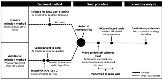 In the period 5 May–1 July 2020, persons above 18 years of age attending the testing facility with symptoms of upper respiratory tract infection were asked to participate in the study. There were no exclusion criteria. In addition, to increase the number of SARS-CoV-2-positive patients in the study, we also invited already confirmed SARS-CoV-2-positive patients to participate in the study. These patients received a phone call informing them of their SARS-CoV-2-positive status from a previous test. If they agreed, a new appointment for SARS-CoV-2 testing—as a part of the study—was scheduled, i.e., within a few days following their initial SARS-CoV-2-positive sample, see Figure 1.