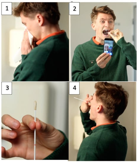 At arrival at the testing facility, persons referred for testing were informed about the study verbally and in writing. After giving informed consent, those volunteering for the study provided a self-collected sample and a HCW-collected sample. Self-collection of samples was done in a separate room at the COVID-19 testing facility, where the study persons received written and Supplementary Video S1 instructions. The two-minute long instructional Supplementary Video S1 was produced specifically for the present study and demonstrated how to perform self-collection of an oropharyngeal sample, using a mirror and the light from the person’s mobile phone, and of a nasal (mid-turbinate) sample, using the same rigid shafted swab, with a hydroflocked tip (Zymo Collection Swab, Zymo Research, Irvine, CA, USA), as shown in Figure 2.