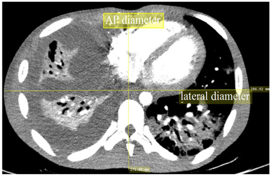 All acquisition parameters data, such as tube voltage (kVp), tube current (mA), rotation time, pitch factor, CTDIvol, and dose-length product (DLP), were obtained from the CT console and recorded into a standardized form. The anteroposterior (AP) and lateral (LAT) lengths of each subject’s image were measured using digital calipers on the scanner console at the mid-slice location of the transverse CT images, as illustrated in Figure 1. Only the scan data of pulmonary embolism scans were included, whereas cases with incomplete details and modified protocols were excluded.