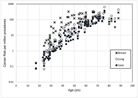 Relationship between cancer risk per million procedure with the age of the subjects.