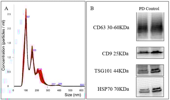 Characterization of isolated plasma exosomes. (A) Nanoparticle tracking analysis of the size distribution of isolated exosomes. (B) Representative Western blot images of the differential expression of exosomal markers CD63, CD9, and TSG101 in exosomes isolated from controls and Parkinson’s disease (PD) patients. HSP70 served as the loading control of exosomes.