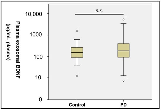 Plasma exosomal brain-derived neurotrophic factors (BDNF) levels among controls and patients with Parkinson’s disease (PD). Data are presented as the median, first quartile, third quartile, and variation. n.s., nonsignificant.