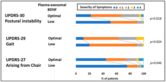 Distribution of the severity of PIGD-related motor symptoms (arising from a chair, gait, and postural stability) within the Unified Parkinson’s Disease Rating Scale (UPDRS) subitem in patients with PD between those with low plasma exosomal brain-derived neurotrophic factors (BDNF) (Q1) and optimal plasma exosomal BDNF (Q2–4) levels.