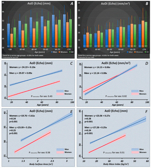 Among the 5343 study participants, we identified 3646 healthy subjects (mean age: 46.8 ± 10.4 years, 1391 women (38.2%)). The distribution of AoD/AoDi in terms of the mean values and standard deviations are displayed in Figure 2. A significant increasing trend of AoD/AoDi was observed with more advanced age for both sexes (p for trend: < 0.001 for both). Increasing age as a continuous variable was tightly associated with a larger AoD/AoDi, with men showing a more pronounced AoDi increment with increasing age than women (p interaction for sex: 0.02) (Figure 2). A larger BSA and BMI were consistently associated with a larger AoD for both sexes, which showed no sex differences (p interaction for sex: NS).