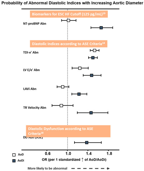 Probability of abnormal NT-proBNP by ESC HF cut-off (>125 pg/mL) and diastolic functional indices proposed by ASE criteria with larger AoD and AoDi. The odds ratio (OR) was 1.44/1.50 for LV septal e′ and lateral e′, both p < 0.001. Abbreviations as in Table 2. Abn: abnormality; AoD: aortic root diameter; AoDi: indexed aortic root diameter; E/e′: averaged early mitral inflow E to mitral annulus relaxation velocity e′ ratio; TDI-e′: averaged peak mitral annulus relaxation velocity e′; LAVi: left atrial volume index; Nt-ProBNP: N-terminal pro-brain B-type natriuretic peptide.