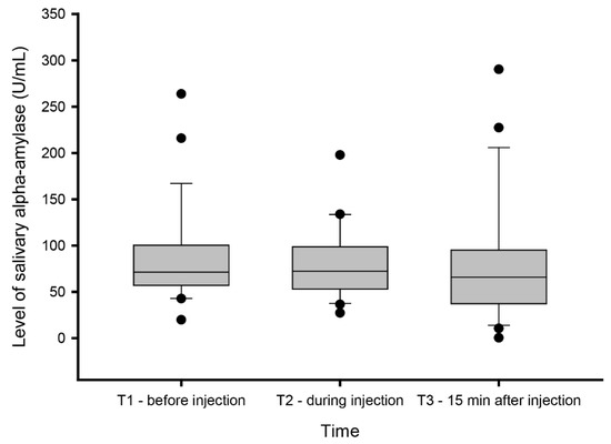 Nevertheless, our findings should be interpreted within the context of certain limitations. For instance, the pain induced had a short duration, which does not accurately mirror pain under normal pathological circumstances, and the participants were aware of the experimental pain, which may have influenced the stress response. However, the experimental protocol was very rigorous, which should remove such a confounding factor. Furthermore, one factor that may have affected the sAA levels is the human salivary amylase gene, of which the expression is affected by the amount of starch in the diet [28]. When analyzing the results, it could also be observed that more than half of the participants still reported mild pain 15 min after the injection. This time interval was set based on earlier experiments showing that the pain experiences usually decreases 15 min after injection of the hypertonic saline into the masseter muscle [36,37]. It may be suggested to wait longer than 20–30 min for the pain to completely disappear until saliva is collected.