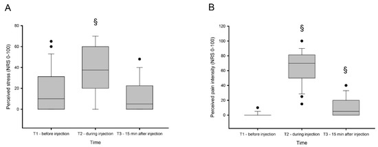 Perceived stress and pain. Perceived stress (A) and pain (B) levels measured on 0–100 numeric rating scale (NRS) before (T1), during (T2), and 15 min after (T3) experimentally-induced muscle pain by injection of hypertonic saline 0.4 mL (56.5 mg/mL) into the masseter muscle. § indicates significant difference when compared to baseline.
