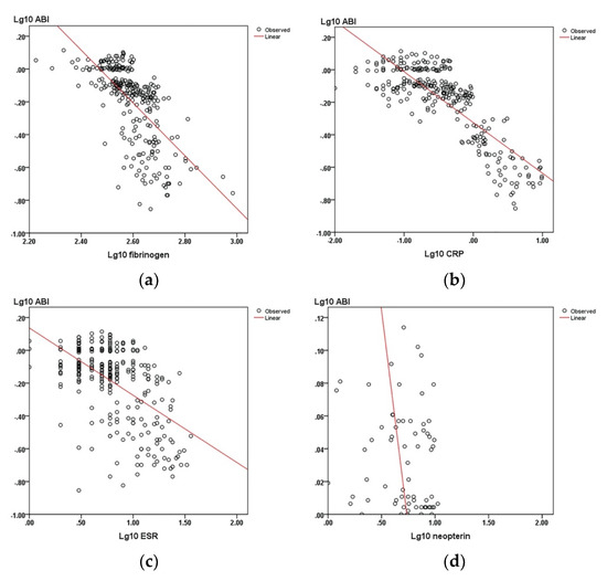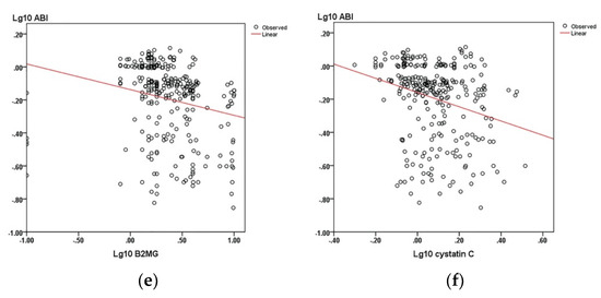 The correlations between the ABI and biomarkers: (a) Fibrinogen; (b) CRP; (c) ESR; (d) neopterin; (e) beta-2-microglobulin; and (f) cystatin C.