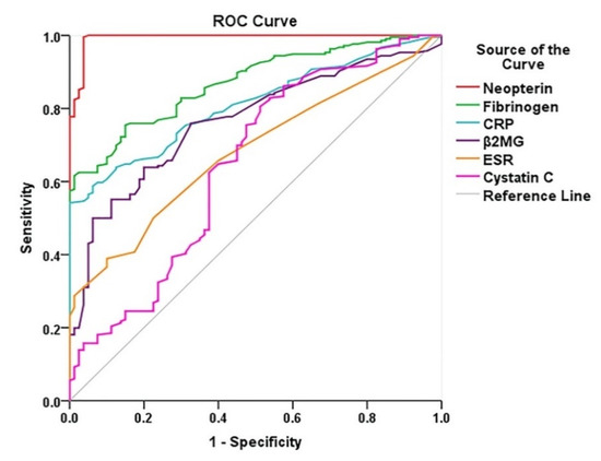 The ROC curves show an accurate diagnostic performance for all six biomarkers. The AUCs for neopterin, fibrinogen, and CRP were higher than 0.8 (Figure 2) and the rest of the AUC values were higher or close to 0.7. AUCs for all six biomarkers were highly statistically significant (p < 0.05) (Table 4).