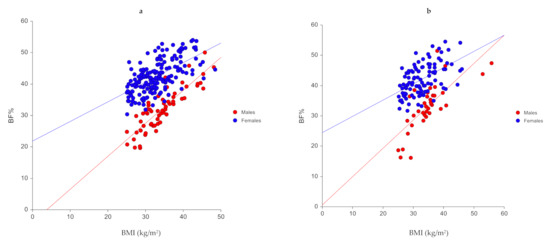 According to the World Health Organization (WHO) [1] on a global scale, more than 1.9 billion adults are overweight (body mass index (BMI) ≥ 25 kg/m2), and of these over 650 million are obese (BMI ≥ 30 kg/m2) [1]. In other words, nearly 39% of adults were overweight in 2016, and 13% were obese [1]. Moreover, according to the same source, since 1975 the prevalence of obesity in the world has nearly tripled [1]. Beyond the BMI cut-off, the WHO originally defines overweight or obesity as an increased body fat (BF) accumulation in the adipose tissue, especially in central visceral regions [1,2]. Thus, the classification of adiposity based on BF quantification and assessment seems to be the most accurate [3], especially when, regardless of BMI, an increase in BF% is associated with major risk factors for cardiovascular diseases [4] as well as all-cause mortality [5]. Therefore, an accurate measurement and/or estimation of the BF% in patients with obesity are of clinical importance [6].