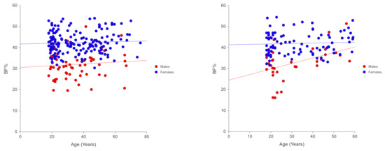 - Jackson, A.S.; Stanforth, P.R.; Gagnon, J.; Rankinen, T.; Leon, A.S.; Rao, D.C.; Skinner, J.S.; Bouchard, C.; Wilmore, J.H. The effect of sex, age and race on estimating percentage body fat from body mass index: The Heritage Family Study. Int. J. Obes. Relat. Metab. Disord. 2002, 26, 789–796. [Google Scholar] [CrossRef]
