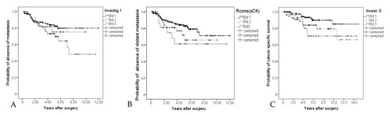 Bd3 was significantly associated with the occurrence of distant metastasis according to the assessments of I1, I2, and I5 (I1: p = 0.049 Bd1 vs. Bd3, Figure 2a; I2: p = 0.042 Bd2 vs. Bd3; I5: p = 0.005 Bd1 vs. Bd 3; and p = 0.029 Bd2 vs. Bd3).