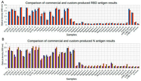 Comparison of commercial (GenScript) antigens (red bars) and antigens produced in our laboratory (blue bars) for the (A) RBD antigen and (B) N antigen. “ELISA+” samples are confirmed by an alternative ELISA test (ProteoGenex), “Negative” samples are collected before the pandemic, “Patient” samples are collected throughout this study. Experiments were done in two replicates.