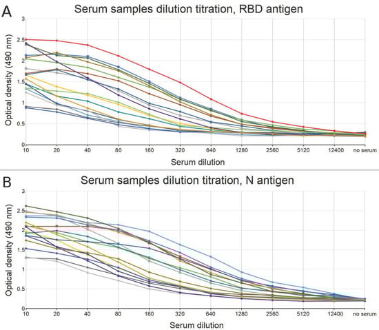 Experiment conditions—such as serum dilution, antigen concentration, and blocking reagent—can be crucial to efficient testing capabilities of the serological assays. Through a series of experiments we obtained optimal experimental conditions for each of the above-mentioned parameters. We have shown that efficient antibody signals could be obtained with serum dilution up to 80× when the RBD antigen was used for antibody detection, and up to 160× with the N antigen. For convenience, we have used the dilution of 50× in our further work. For blocking reagent, casein was selected over non-fat dry milk, since it significantly lowered the signal for negative samples (especially for the RBD antigen), while not affecting the positive sample results. Optimal antigen concentrations for the plate coating were found to be 3.75 μg/mL for RBD and 4 μg/mL for N.