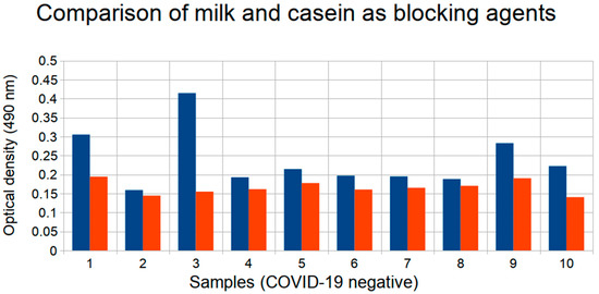 Comparison of milk and casein as blocking agents for ELISA with RBD antigen used for antibody detection on a set of 10 COVID-19 negative samples. Blue bars correspond to results on milk, red bars to casein.