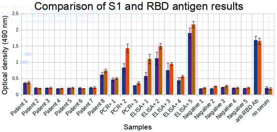 Comparison between S1 (blue bars) and RBD (red bars) antigen results. From left to right: eight results are from patients with uncertain status; three PCR+ and five ELISA+ are COVID-19 confirmed cases; five are negative COVID-19 cases; anti-RBD antibodies used as positive control; no serum (noise level). Experiments were done in two replicates.