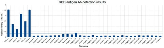 RBD antigen antibody detection results. First 6 samples are positive COVID-19 samples confirmed by PCR (PCR+ 1–6), next 30 samples are negative. Threshold for identifying false positive results is shown in a blue horizontal line. Experiments were done in two replicates.