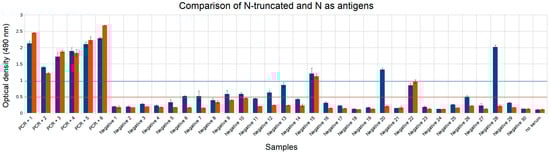 Comparison of N-truncated (blue) and N (red) antigen antibody detection results. The first six samples are positive COVID-19 samples confirmed by PCR (PCR+ 1–6), next 30 samples are negative. Thresholds for identifying false positive results are shown in horizontal lines, blue for N-truncated and red for N. Experiments were done in two replicates.
