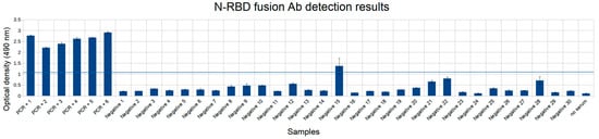 N-RBD fusion antigen antibody detection results. The first six samples are positive COVID-19 samples confirmed by PCR (PCR+ 1–6), next 30 samples are negative. Threshold for identifying false positive results is shown in a blue horizontal line. Experiments were done in two replicates.