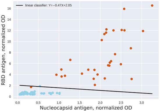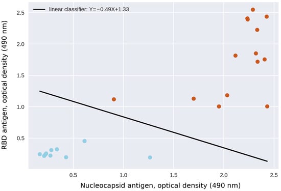 Two positive samples had OD values for the N antigen lower than several of the negative sample results (at the same time their RBD values were high). One negative sample, on the other hand, had an RBD value higher than one of the positive samples. While the linear classifier separates most of the samples efficiently, it still yields one false negative result (Figure 9).