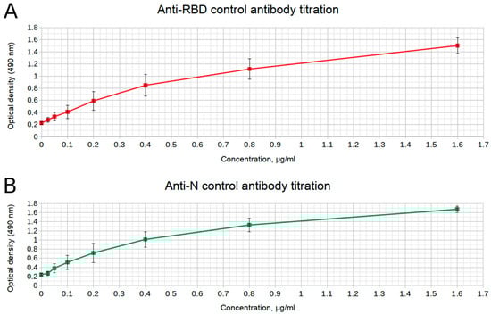 Calibration curves (exemplary) for (A) anti-RBD and (B) anti-N antibodies. Experiments were done in three replicates.