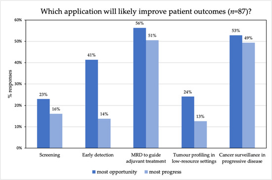 In contrast to early detection of cancer, the polls (Figure 4) showed that the experts were in agreement that there is evidence of the prognostic value of liquid biopsies in MRD detection and cancer surveillance and monitoring of metastatic disease. Several studies have demonstrated that it is possible to distinguish patients with poor survival outcomes using quantitative assays, such as the levels of ctDNA [31,38,51]. However, whether clinical management based on these test results improved survival outcomes remains uncertain. According to the experts, “We do know these tests can be done and that they are a strong marker of relapse, but at this point it is hard to say if the detection of MRD has the clinical utility to improve survival or reduce toxicity from treatment”.