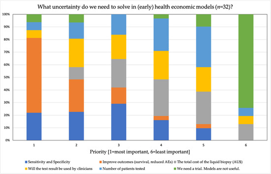 Almost 75% of the respondents (n = 32 available) thought health economic simulation models were useful to guide implementation into clinical care. Respondents also clearly identified that the establishment of clinical benefits, such as increased survival (60% respondents), is the most important implementation factor to address (Figure 4). Other criteria were almost equally important, with the least important being the number of patients tested and the cost of the liquid biopsy test.